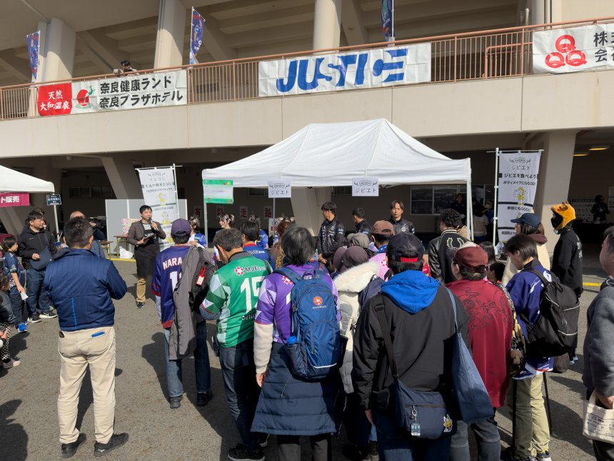 2026年2月14日(土)、Jリーグ所属「奈良クラブ」のホームゲーム(対FC今治戦)が行われたロートフィールド奈良にて、「奈良ジビエ」体験イベントを開催しました。