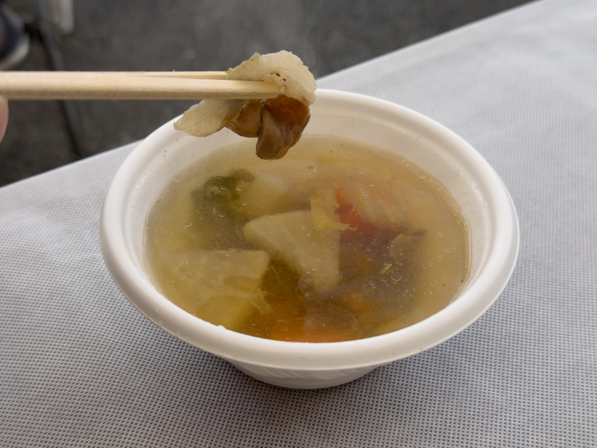 クイズハンティングの参加賞として、先着100名に奈良県産の猪肉を使った猪汁の無料提供を行いました。用意した100杯は、配布開始から短時間ですべてなくなる盛況ぶりでした。