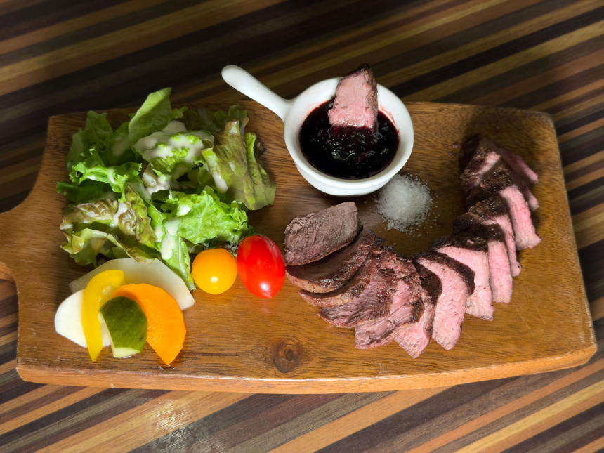 ソースには、その時季に千葉県内で採れる果物を合わせます。取材時の11月上旬は、富津市産のブルーベリーをたっぷり使った赤ワインソース。時期によっては、姉崎産のいちじくと赤ワインのソースに変わるそうです。ほんのり甘酸っぱい果実の風味が赤身の香りを引き立てており、感想は「美味い!」の一言。