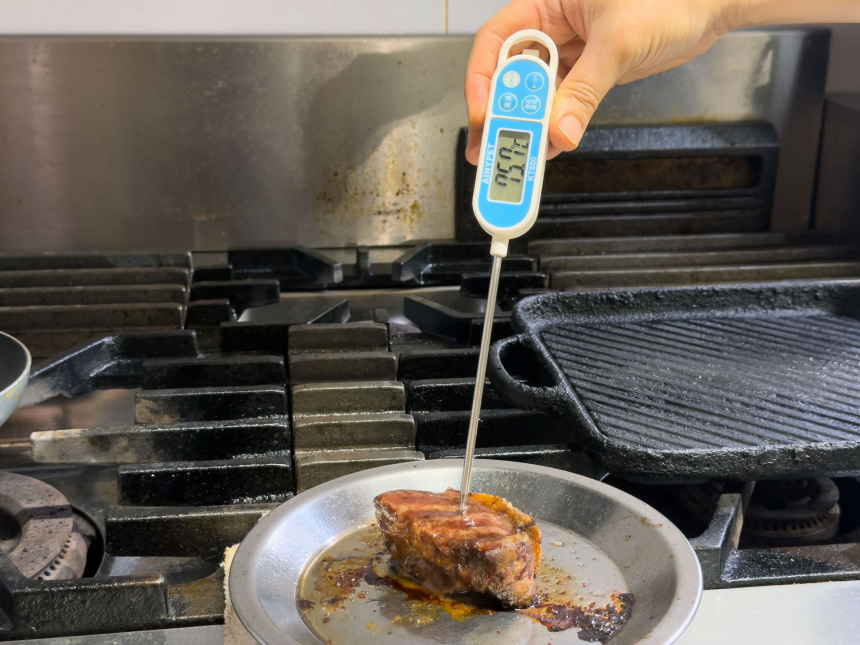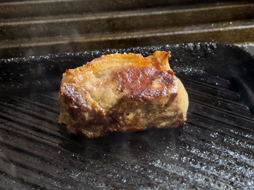 その調理はとても丁寧です。まずロース肉の表面をフライパンで香ばしく焼きつけ、肉汁を内部に閉じ込めてからオーブンへ。中心温度計を使い、衛生的にも美味しさの面でもバランスがよいとされる75度までじっくりと火を入れます。
