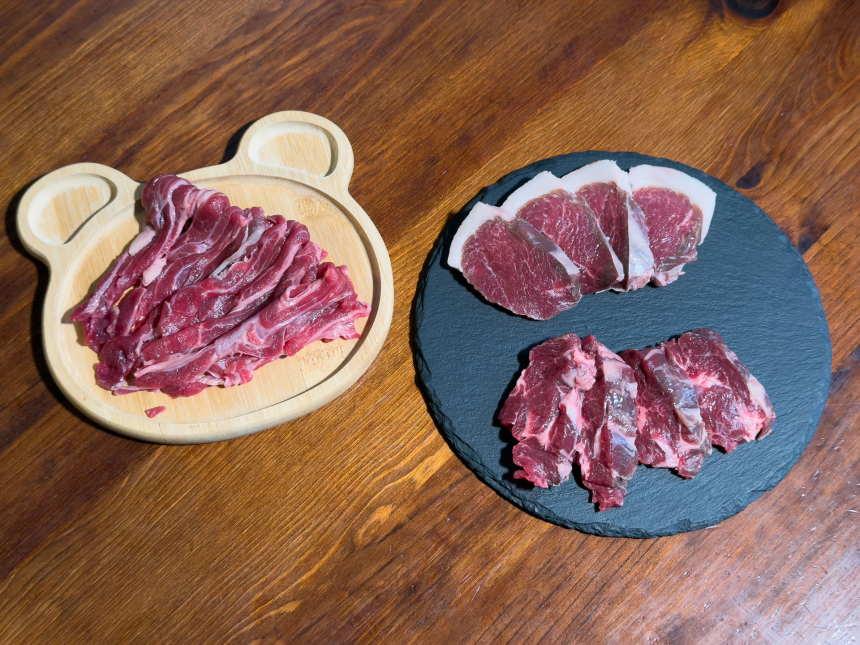 この日いただいたのは、エゾシカのシキンボ(1,650円・税込。写真右上)、エゾシカのカタロース(1,540円・税込。写真右下)、そしてヒグマのバラ肉(2,800円・税込。写真左)の3種です。