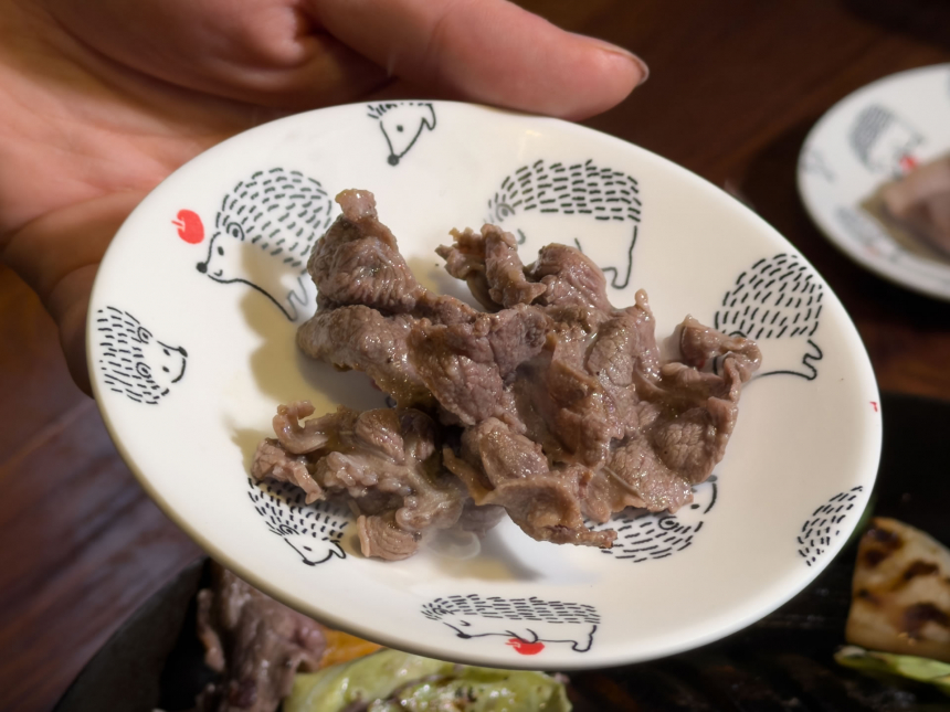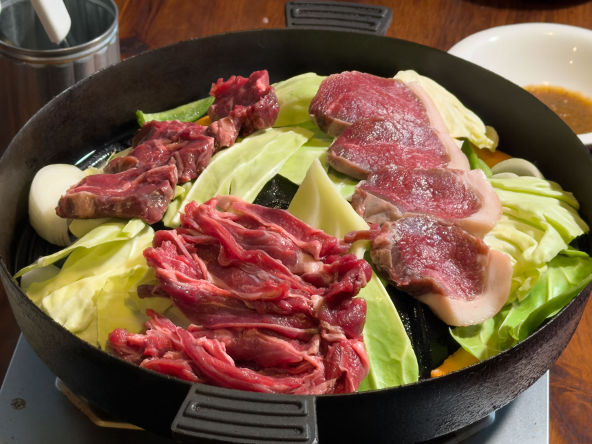 初めて訪れる方へのおすすめは、鹿と羊食べ比べセット(3,850円・税込)です。ジンギスカンスタイルで鹿肉と生ラムを一緒に味わえるお得な内容で、最初に鹿肉と生ラムを一緒に焼き、その後に極上ラム(羊の肩ロース)が登場するという構成になっています。一度に出すと肉同士の味の違いがわかりにくくなるため、分けて提供する工夫がされています。