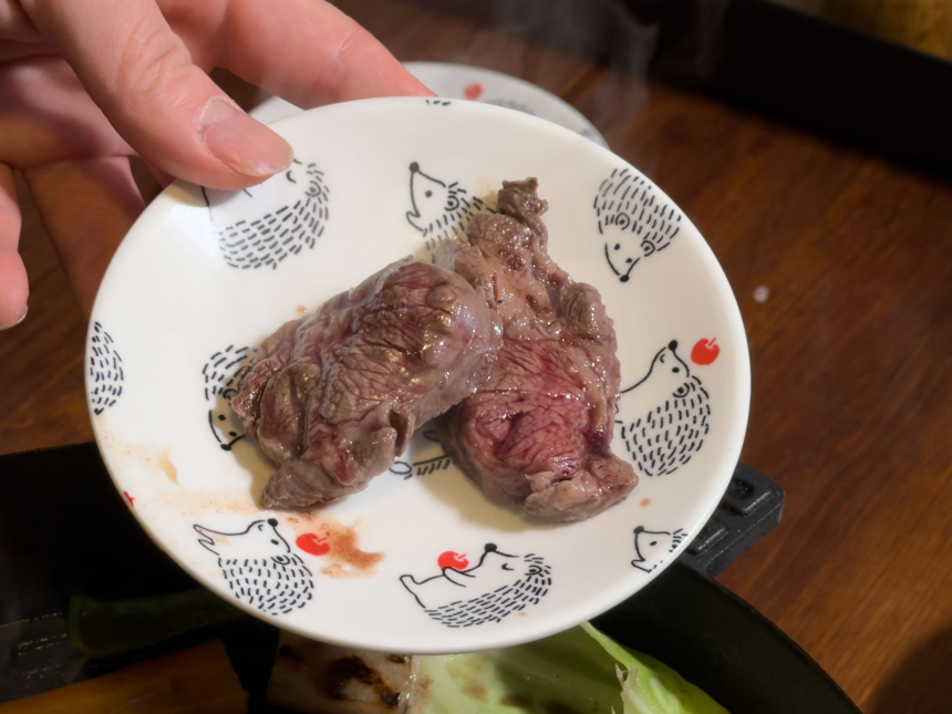 最初に焼き上がったのはエゾシカのシキンボです。シキンボとは鹿のもも肉の裏側にある部位で、1頭から2本、約2kgほどしか取れない希少な部分です。脂が適度にのっており、肉質はしっとりとして柔らかく、噛んだ瞬間にじゅわっと肉汁がにじみ出てきます。塩コショウでいただくと、鹿肉の甘みと旨味がダイレクトに伝わってきました。