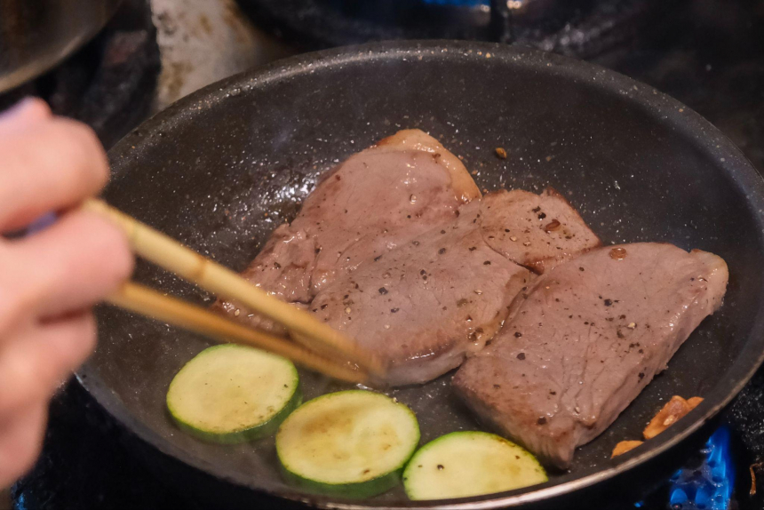 盛り付けの際は、鹿肉と相性抜群の特製のステーキソースを合わせます。添えられたズッキーニとガーリックを鹿肉と合わせていただくと絶品で、常連のお客様からも「ズッキーニとガーリックを追加して欲しい」とリクエストがあるほどです。