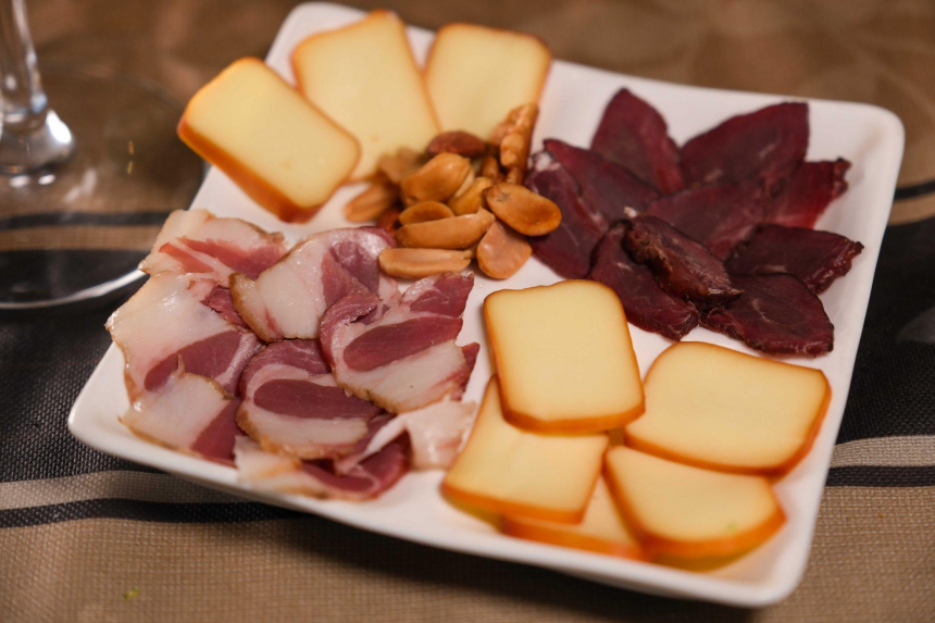 3品目は自家製スモーク三種セット(1,870円・税込)です。鹿肉、猪肉、チーズ、そしてナッツを燻製にしています。