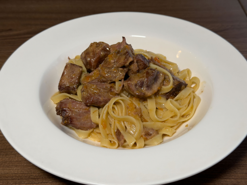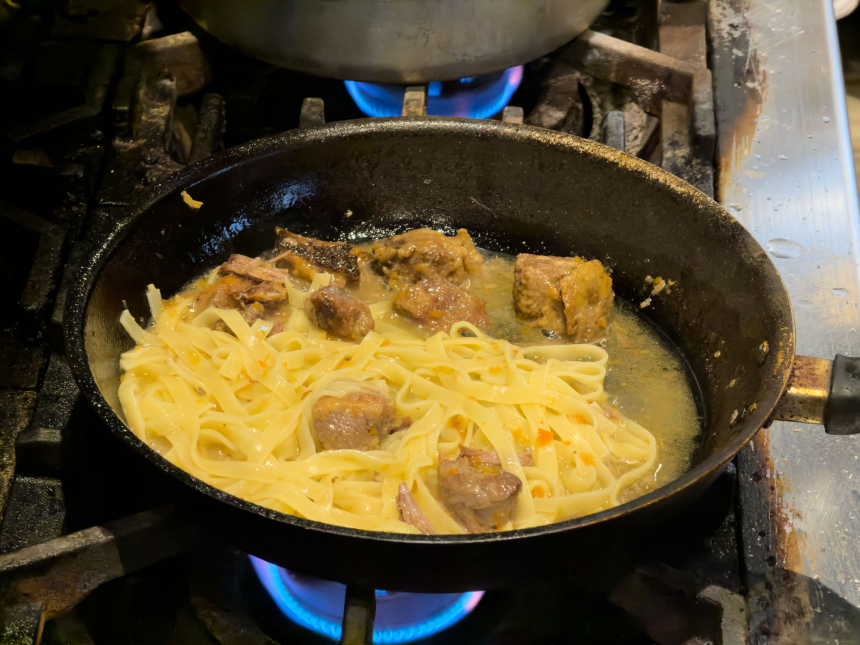 味付けは白ワイン、塩、ソフリット(香味野菜の炒め)、オリーブオイル、そして少量のニンニクだけ。こうしたあっさりとした味付けだからか、猪本来の甘みが際立ちます。脂身の部分からじわりとにじむ甘さと、赤身の肉肉しい旨味がソースに溶け込み、食べ進めるほどに深みが増していく一皿です。