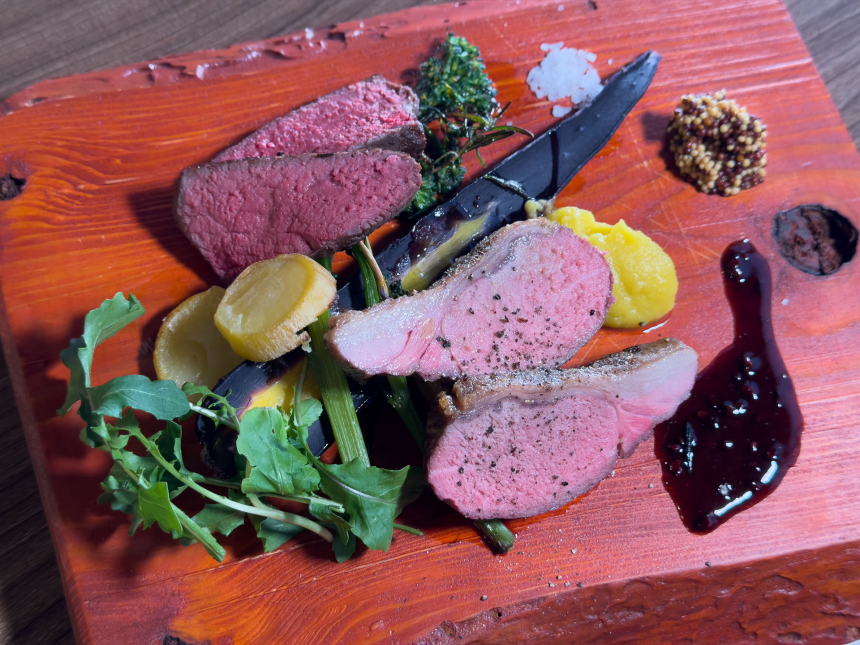 もう一品は、猪と鹿を一皿に盛り合わせた「猪&鹿の食べ比べ」(3,100円・税込)です。猪は背ロースをフライパンでしっかりと表面を焼きつけた後、ハーブの香りを移したオイルとともにオーブンへ。5分焼いてから数分休ませ、肉汁を落ち着かせてからカットするという丁寧な火入れが施されています。一方、鹿肉はあらかじめ低温調理したものを使い、表面を香ばしく焼き上げて仕上げています。