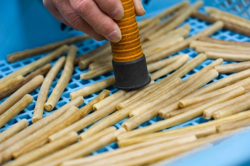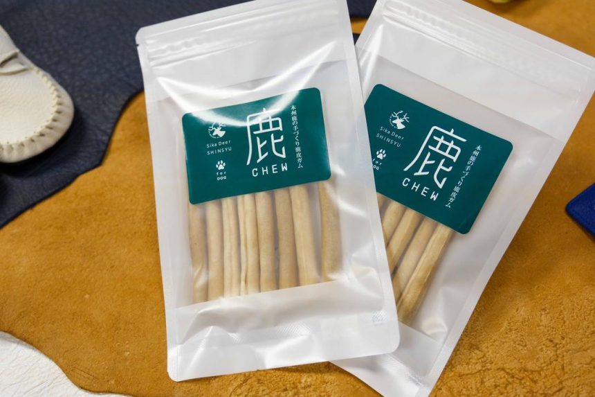 そのためどうしても革製品としての活用には限界があります。そんななか、皮のままの活用方法はないかと、候補のひとつとして挙がったのがペット用のガムでした。牛床革(とこがわ)を使用したペット用のガムにヒントを得て、鹿皮でもできないかと製品開発にチャンレンジし、1年半の開発期間を経て完成しました。