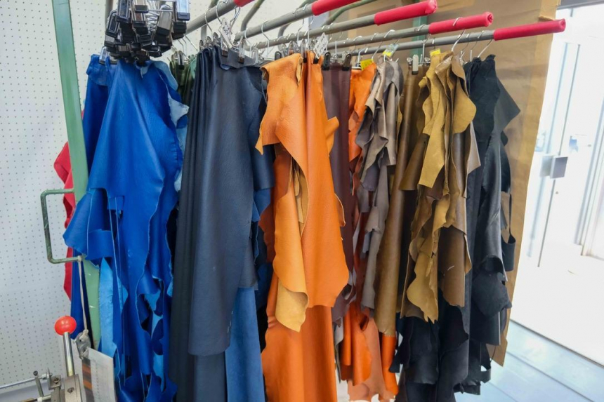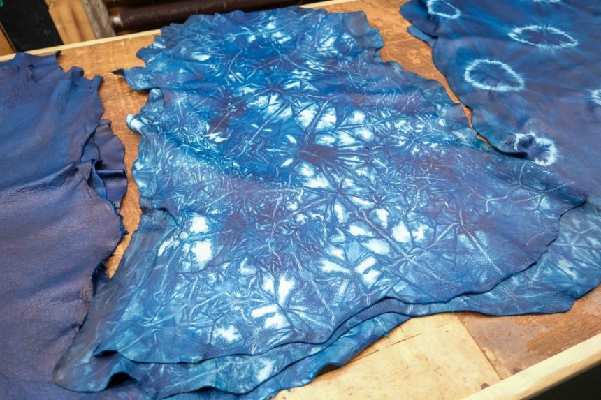 革にする皮は、鞣し処理を施し、染色を行い、商品へと加工されます。