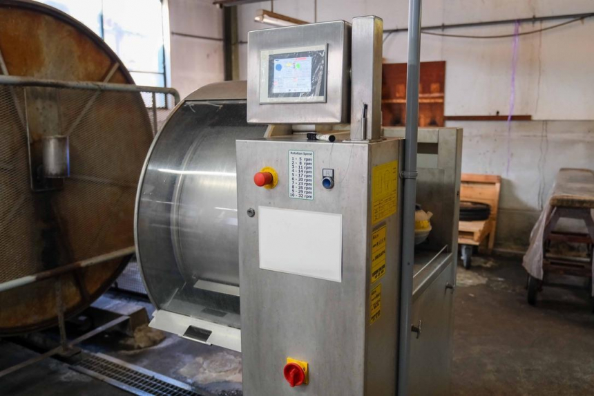 一方、穴やシワの問題から革にしなかった鹿皮は、手づくり鹿皮ガムにするため、ペットフード用に新たに導入したこちらの小型のドラムで、通常の革づくりとは分けて処理を行います。
