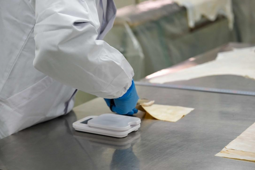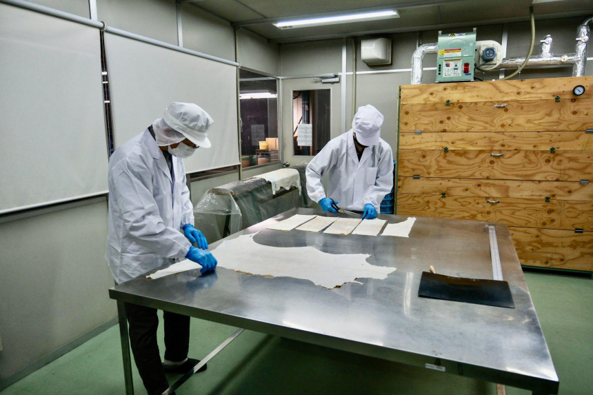 ペット用の食品を扱うため、土足厳禁となっており、従来の革製品の製造ラインとは別に作業しています。